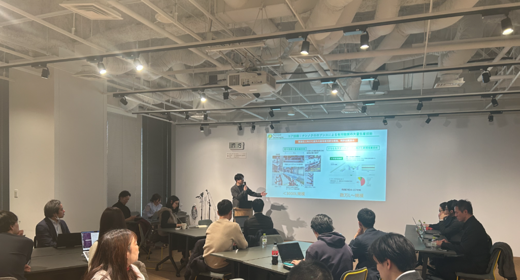 株式会社ファイトリピッド・テクノロジーズは、東京科学大学発のスタートアップとして、微細藻類を活用した開発に取り組んでいます。同社の強みは、一種類の藻類からオメガ3脂肪酸などの機能性成分、バイオ燃料、高タンパク質食品素材を同時に生産できる点にあります。高付加価値素材と低付加価値素材を組み合わせることでコスト競争力を確保し、化石燃料や動物性タンパク質の代替を現実的な水準で目指しています。現在はNEDOの支援のもと資金調達し、大規模プラントの設置に向けた準備を進めており、工場排出CO2を藻類培養に活用するなど、GX推進の観点からも注目される循環モデルを構築しています。
