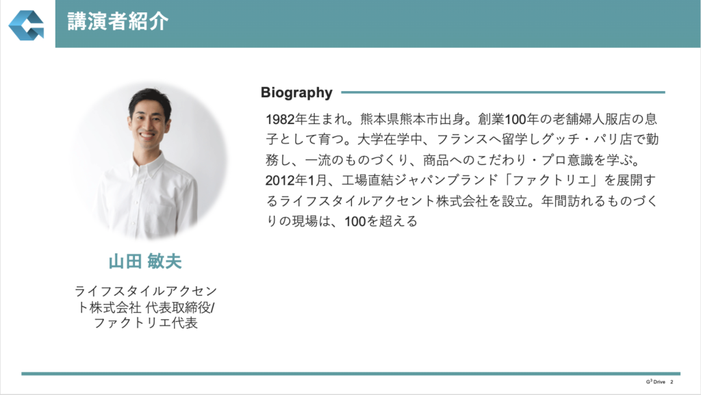 登壇したのは、ライフスタイルアクセント株式会社/ファクトリエ代表の山田氏。熊本の衣料店に生まれ、若くして渡欧。パリでの就業経験を通じて「本物のブランドは工場から生まれる」という認識に至り、日本各地の工場を訪ね歩く活動を開始した。衰退が続く産地の現実を前に、下請け依存からの脱却と“工場が主語のブランドづくり”を掲げ、全国の工場と協業を広げてきた。