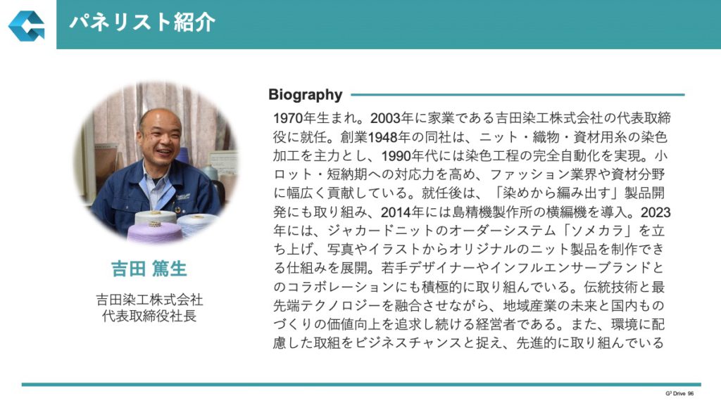 ファシリテーターは弊社代表の木村が務める。パネリストは、基調講演を頂いた2名(山田氏、市川氏)に加え、吉田染工株式会社 代表取締役社長 吉田氏が参加した。吉田氏は1948年創業の染色加工企業を率い、工程の自動化や横編機導入、新サービス「ソメカラ」などで伝統と先端を接続しつつ、環境配慮をビジネス機会へと変換してきた経営者である。