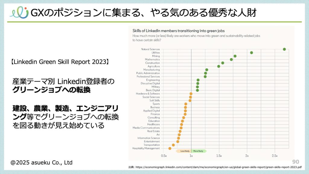 市川氏は“グリーンジョブ/グリーンキャリア”という労働市場の潮目を挙げ、建設・エネルギーを中心に国内でも需要が伸びると説明する。若手ほど将来性で企業を選ぶ傾向が強く、GXは人材獲得の武器になりうる。