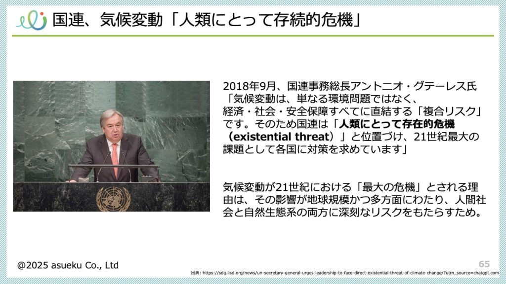 市川氏は、気候変動を人類にとっての存続的危機と位置づけ、CO₂の過剰排出が温暖化の速度を加速させることで社会や生態系の適応時間を奪っている現状を指摘している。欧州の熱波や原発停止、水害と酷暑の交互発生などは、このリスクが既に先進国の実体経済や社会基盤に影響を与えていることを示している。