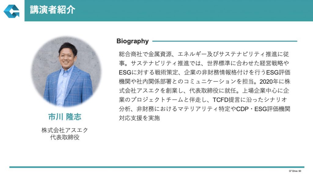 本講演には、商社で金属・エネルギー分野に長年従事し、パリ協定後の欧州でエネルギー戦略の転換を現場で体感してきた株式会社アスエクの市川氏が登壇。現在は脱炭素・サステナビリティ領域の事業伴走に取り組む。