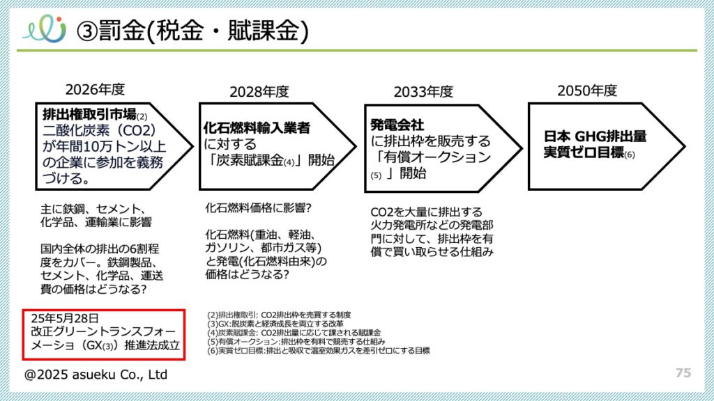 具体的には、2026年度に改正GX推進法により年間10万トン以上排出の企業に排出権取引所への参加が義務化され、輸出産業や先進企業が自社排出のオフセットに動き、やがて製品・サービス価格への転嫁が生じる見通しである。2028年度には化石燃料の輸入事業者に炭素賦課金が導入予定で、ガソリン・軽油・重油や火力由来の電力料金に間接的に上乗せされ、見えにくい形でのコスト上振れが発生してインフレ要因と混在して認識される可能性が高い。