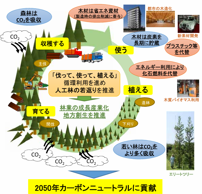 林野庁は、「伐って、使って、植えて、育てる」という森林資源の循環利用の確立を基本方針としており、持続可能な森林経営の推進を図っています。